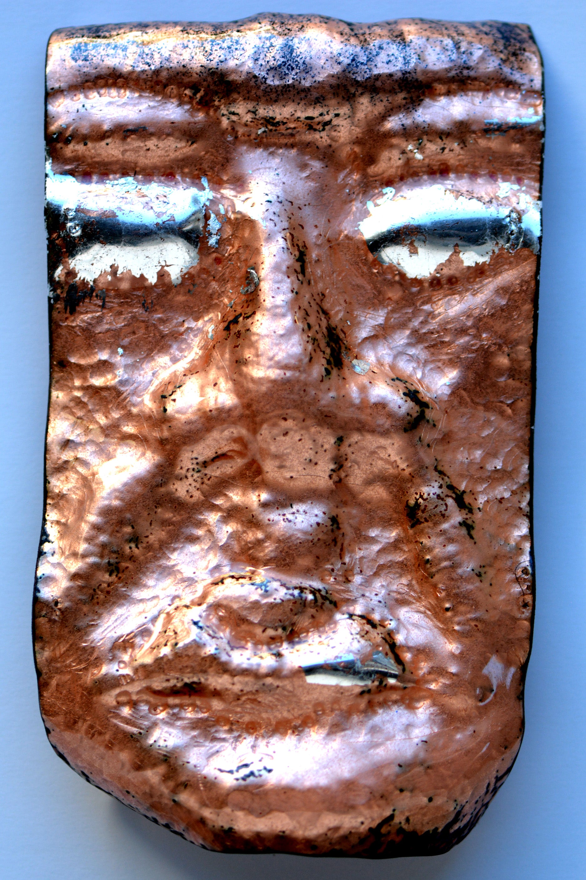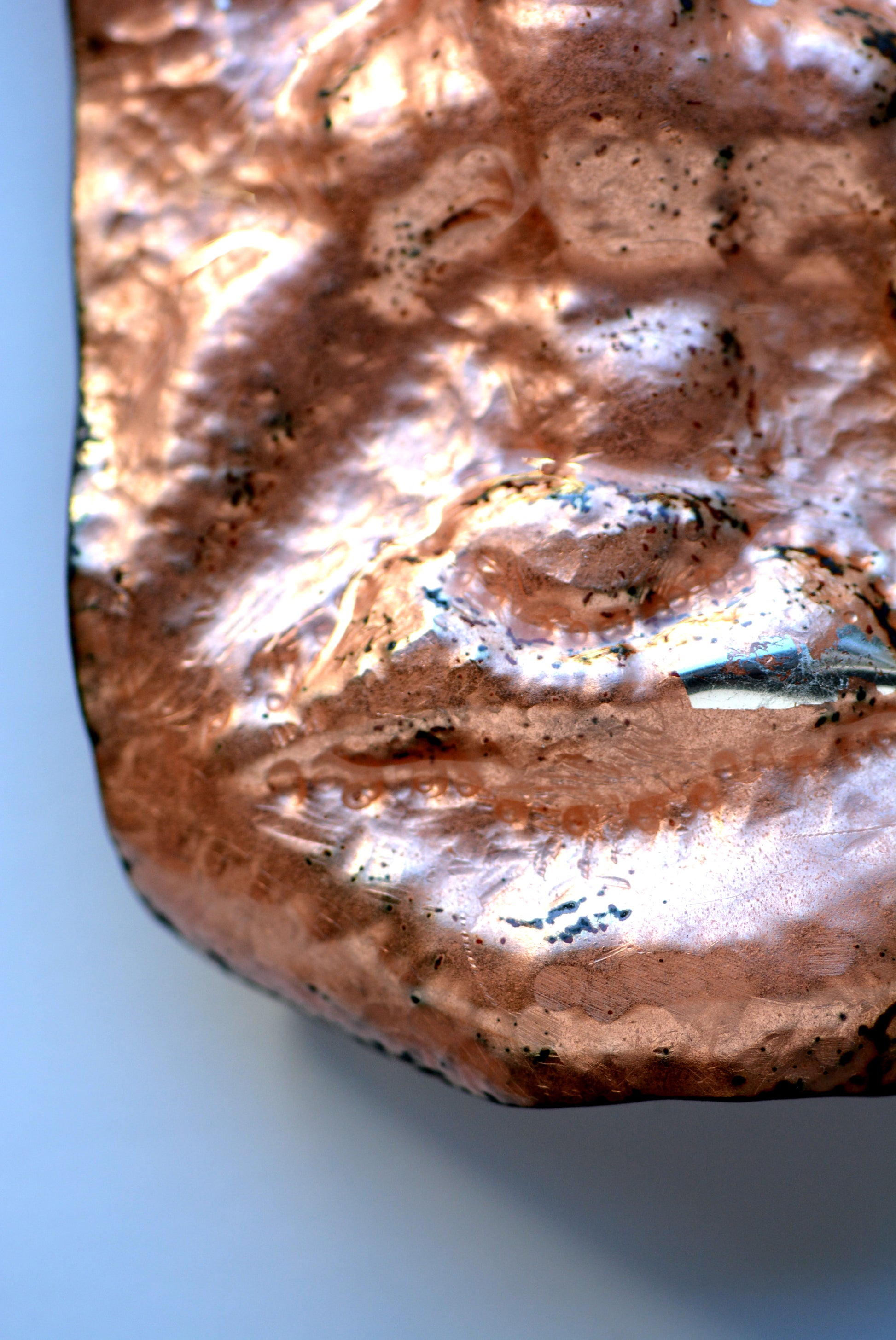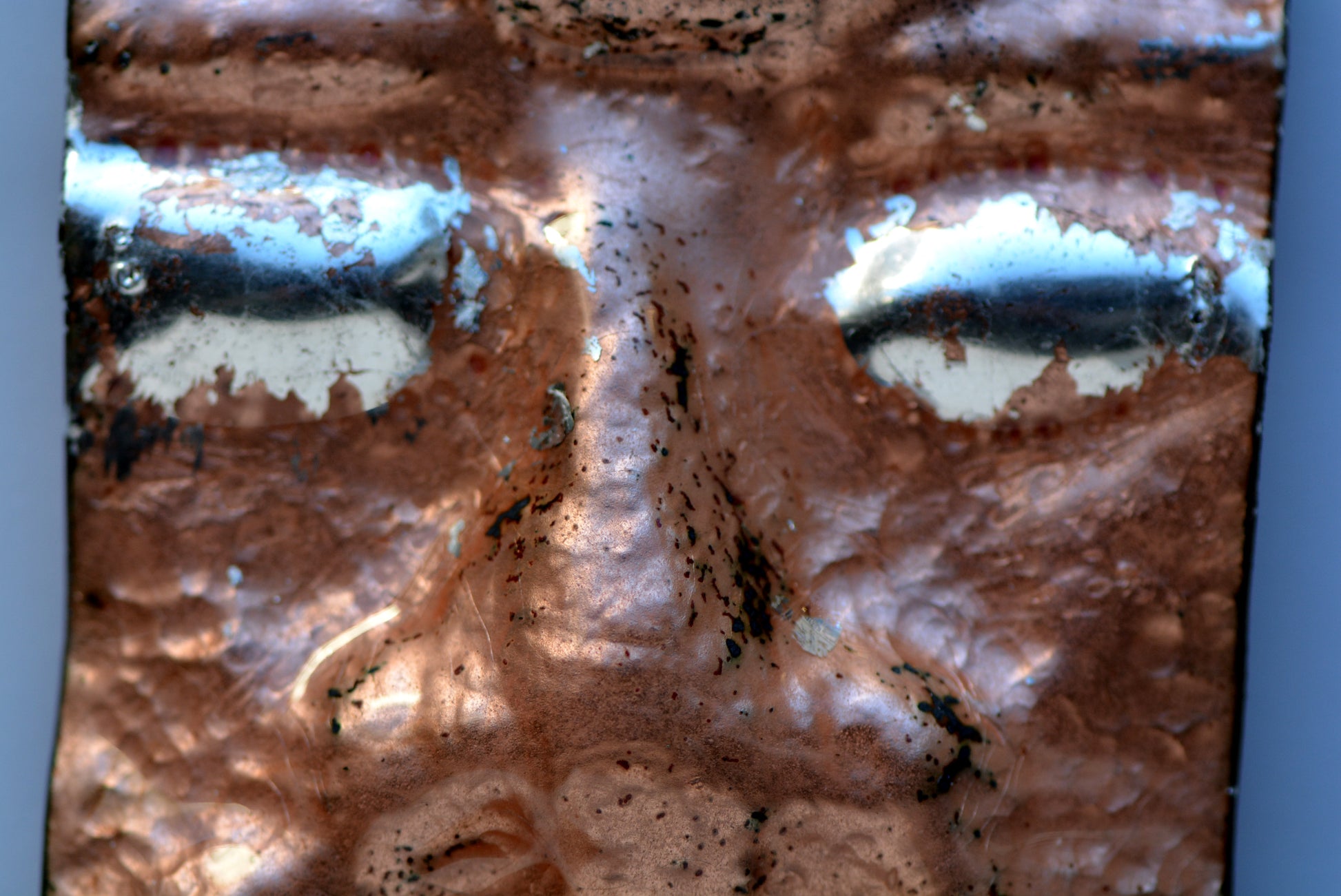 Starting from those same carved stones—faces sculpted by ancient hands—I began to wonder about human expression: how to represent it, how to give it form. I started experimenting with shaping expressions -mimicking ancient relics- on copper, sculpting the metal and recreating those same lines. The hammer transforms the material in two ways: on one side it expands and deforms the surface; on the other, it leaves marks rich with texture.