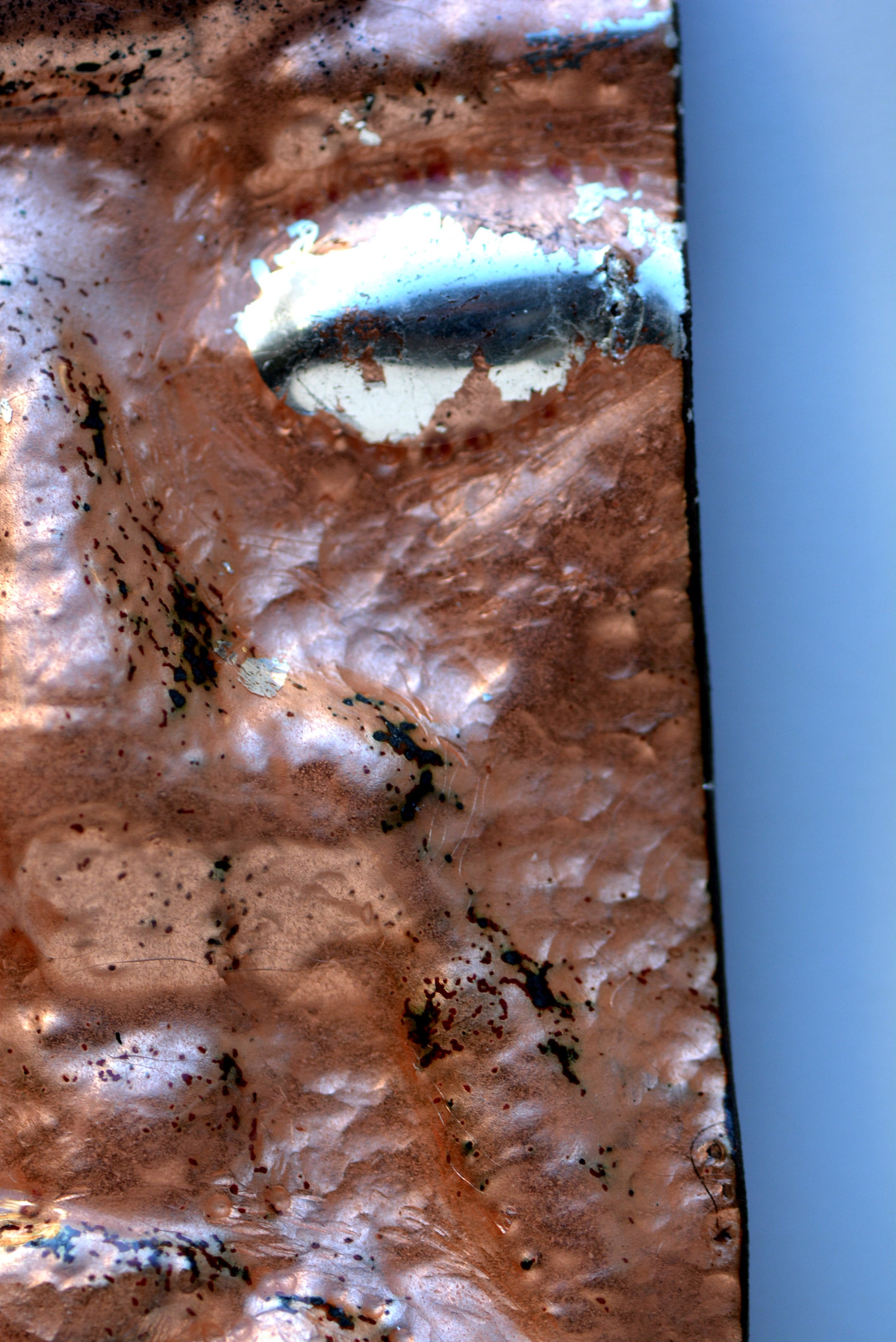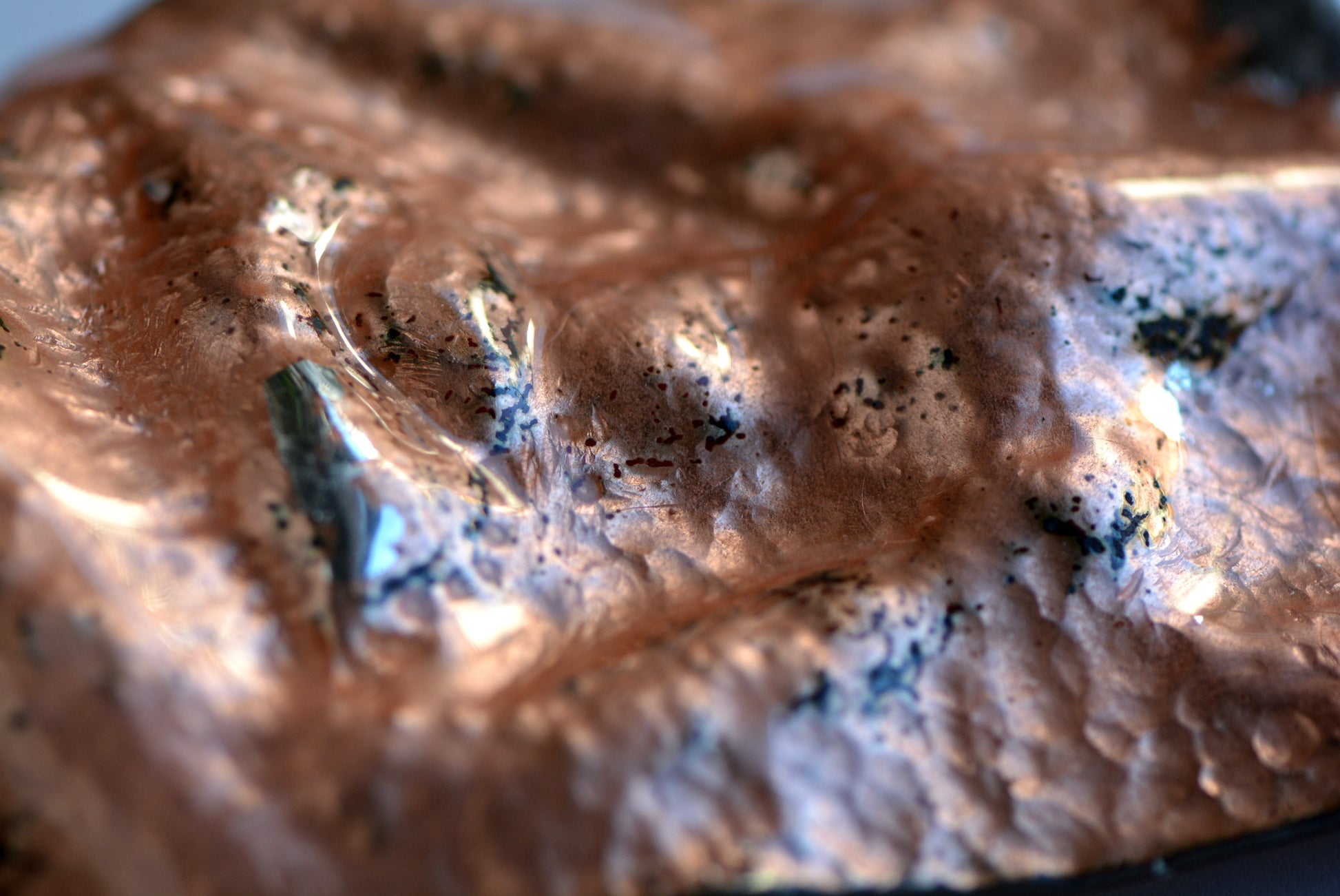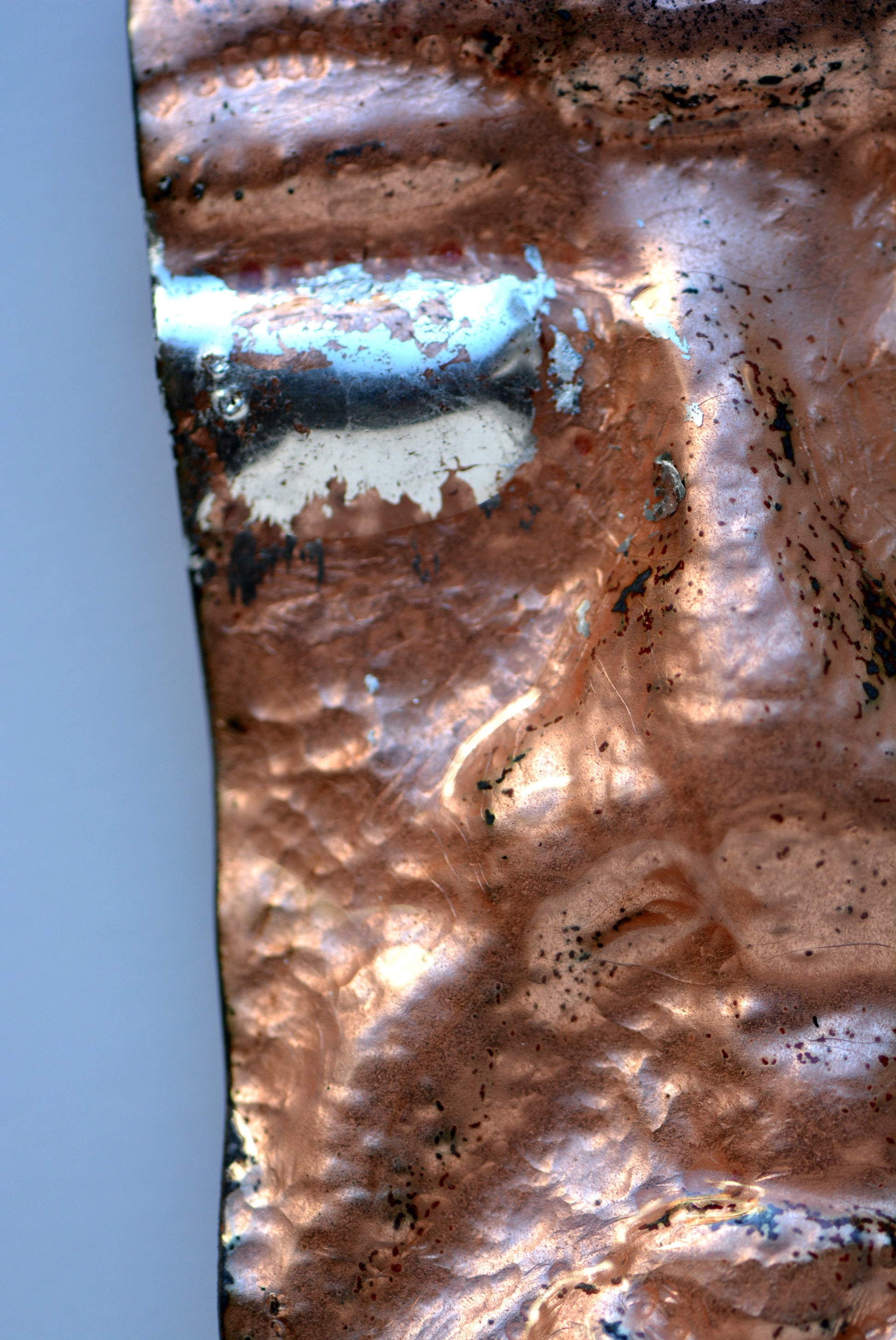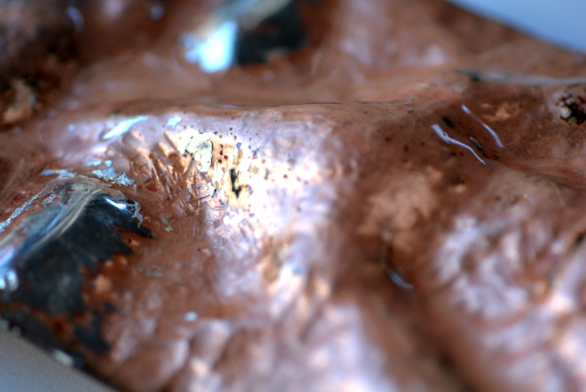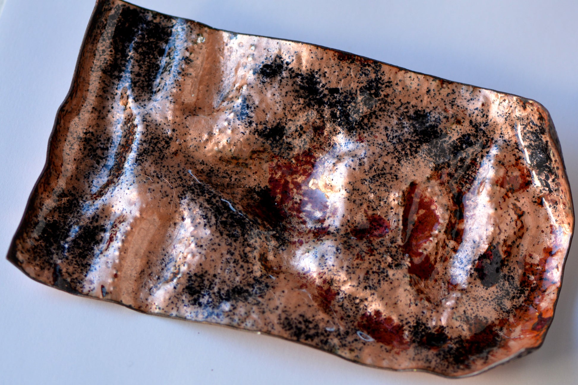 Una combinazione di firescale, ossidazione del rame, smalto nero polverizzato e foglia d’argento restituisce la superficie di una pelle martellata e materica.