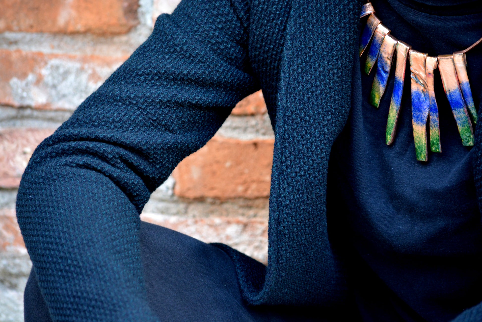 A thin square bar of copper, running along both the top and bottom, encircles the wearer’s neck with a hammered texture, enriched at the meeting point by a small half-sphere at its base.