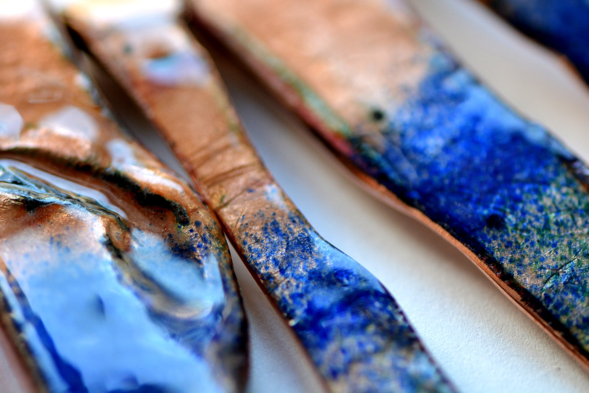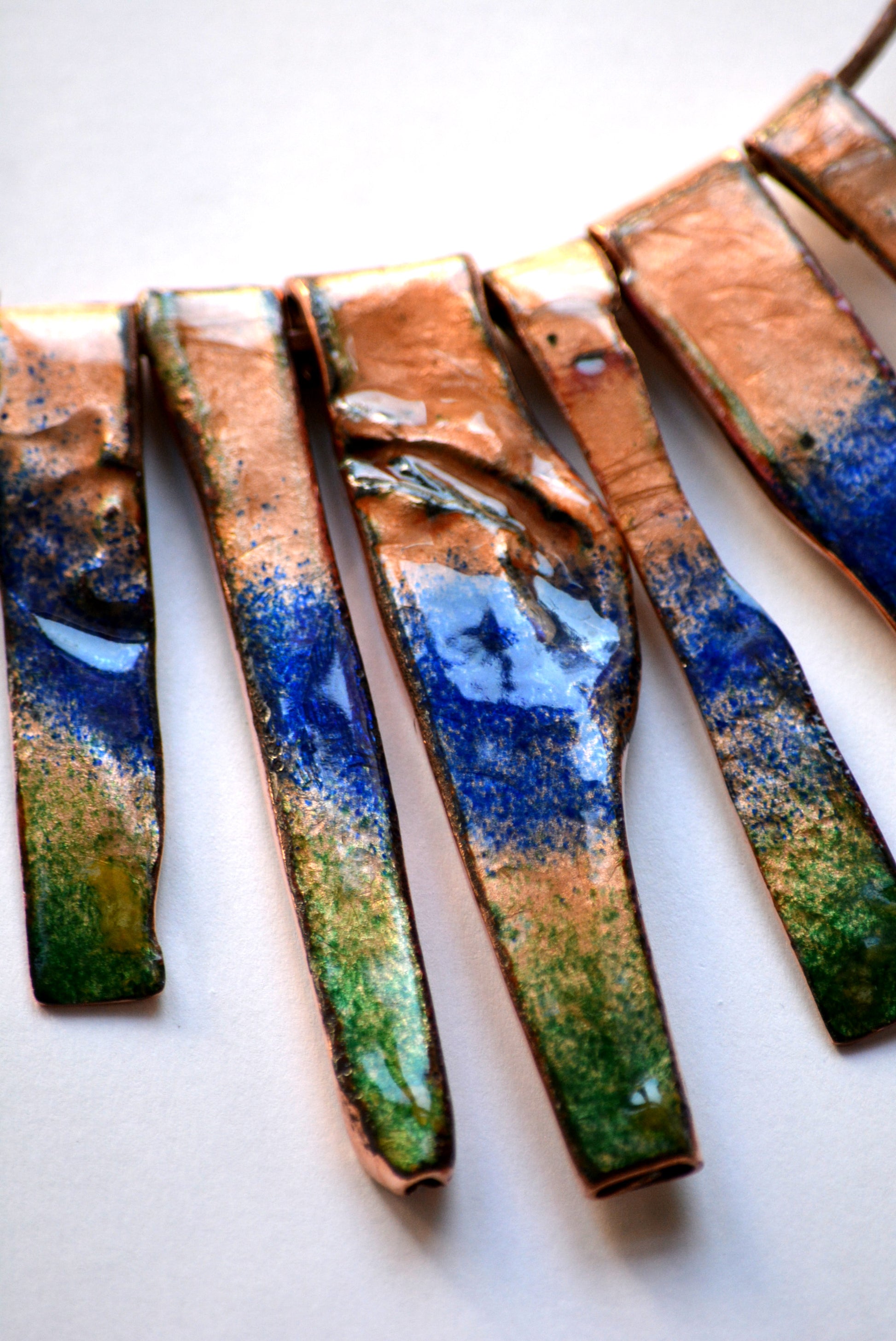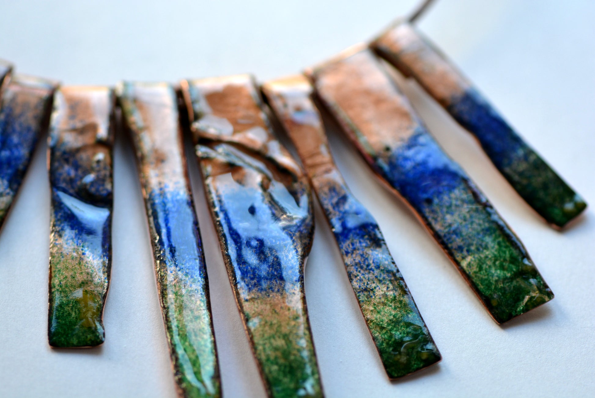 The idea is to represent an ancient relic through a modern interpretation, using enamel to emphasize texture and depth. The copper slices, instead of being cut, have been broken to convey a sense of roughness—irregular edges and uneven borders. The texture is created through repetitive folding and realignment, giving the pieces the appearance of aged metal.