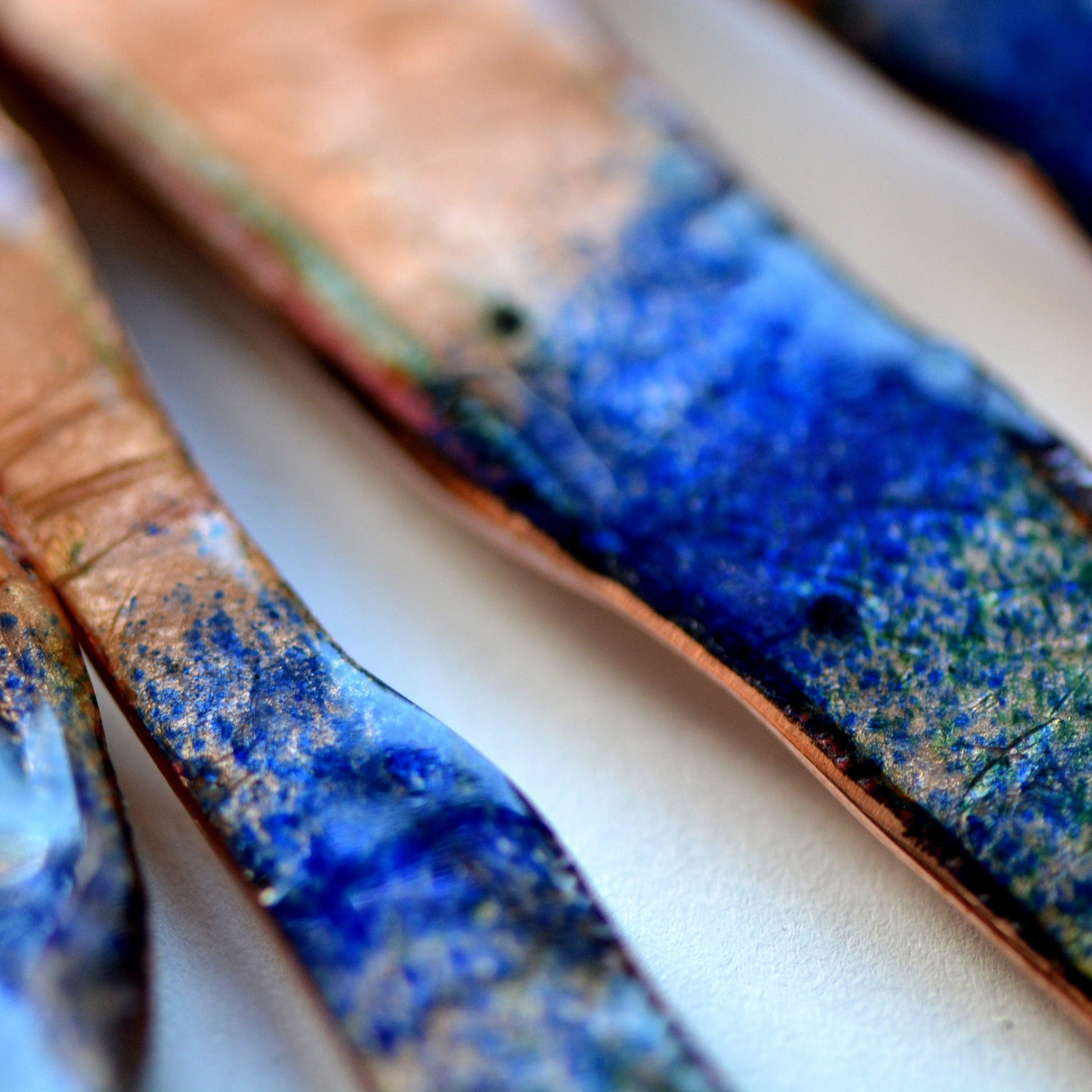L’idea è quella di rappresentare una reliquia antica attraverso un’interpretazione moderna, utilizzando lo smalto per enfatizzare texture e profondità . Le lastre di rame, invece di essere tagliate, sono state spezzate per trasmettere una sensazione di ruvidità — bordi irregolari e contorni disomogenei. La texture è creata attraverso piegature e riallineamenti ripetuti, che conferiscono ai pezzi l’aspetto di un metallo invecchiato.