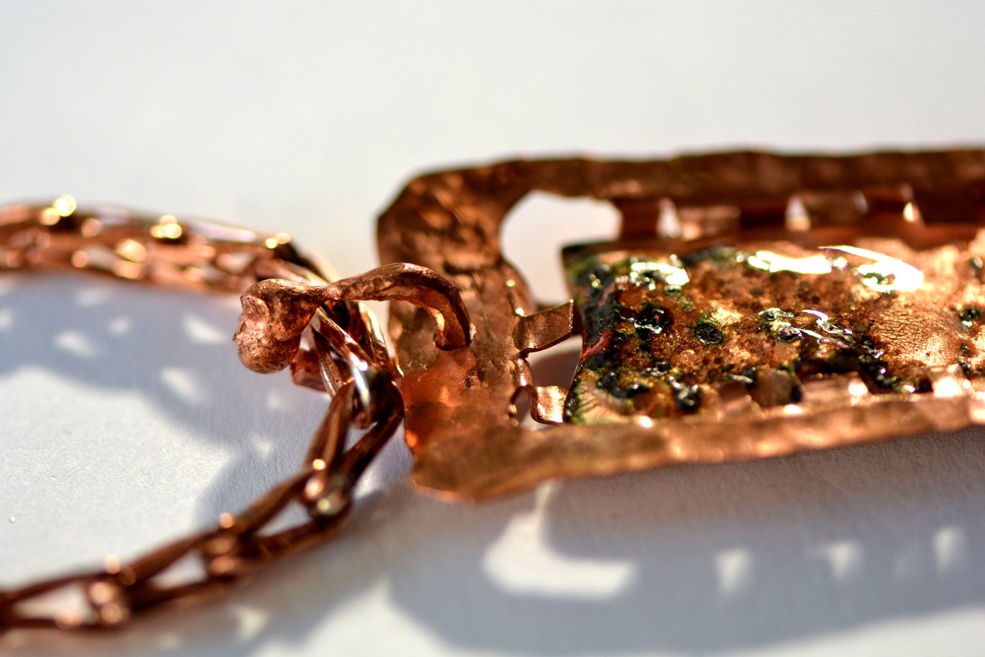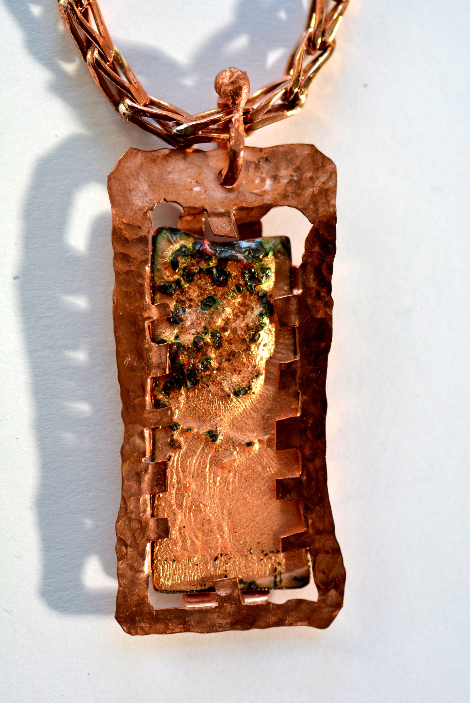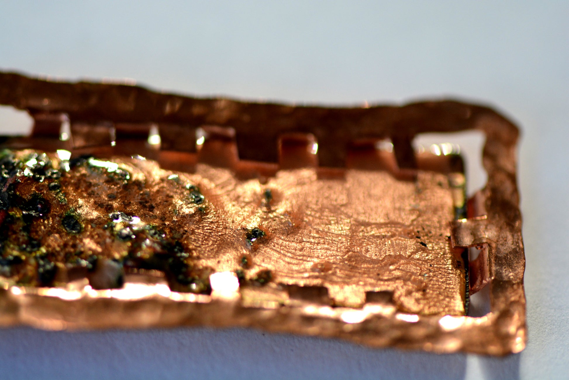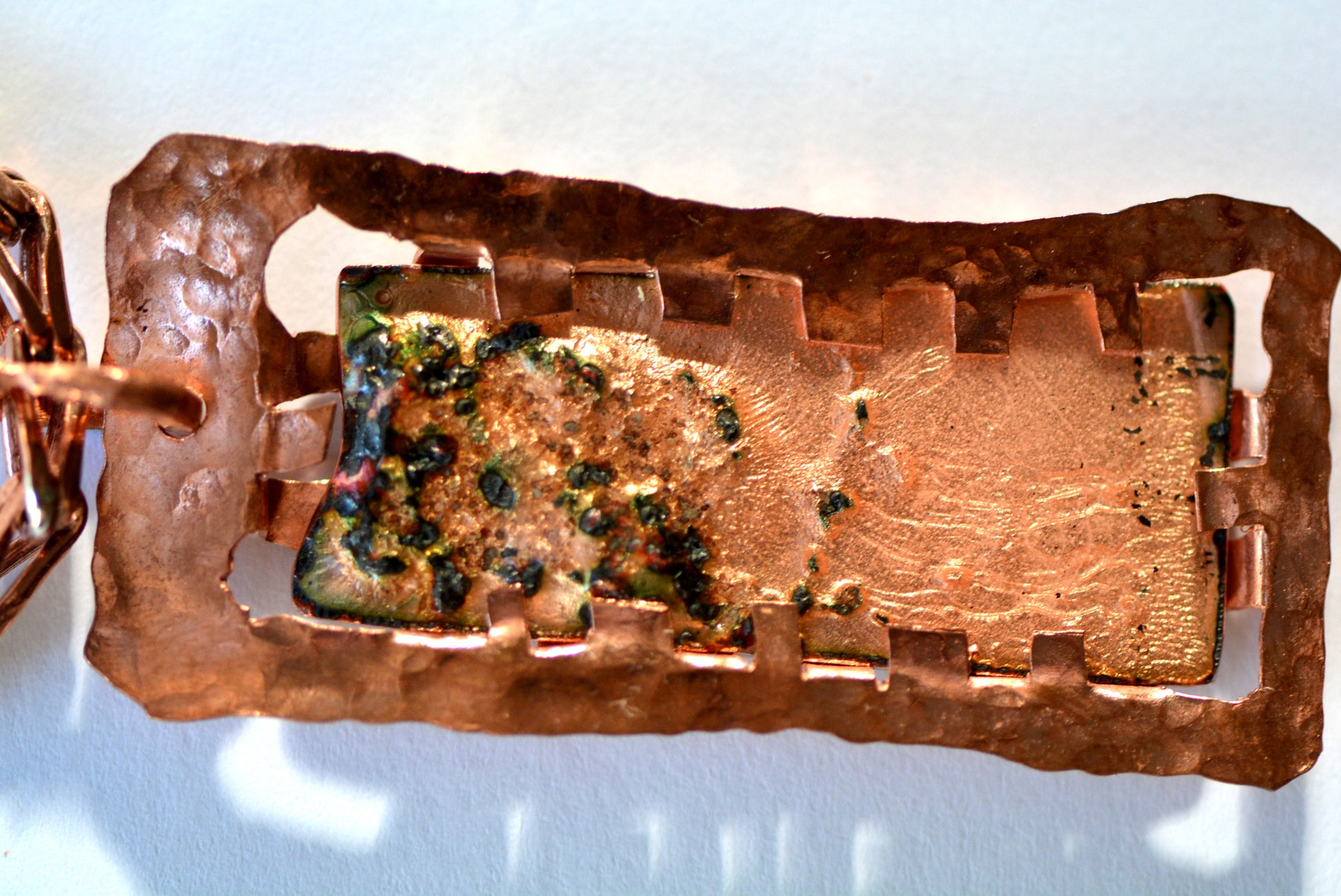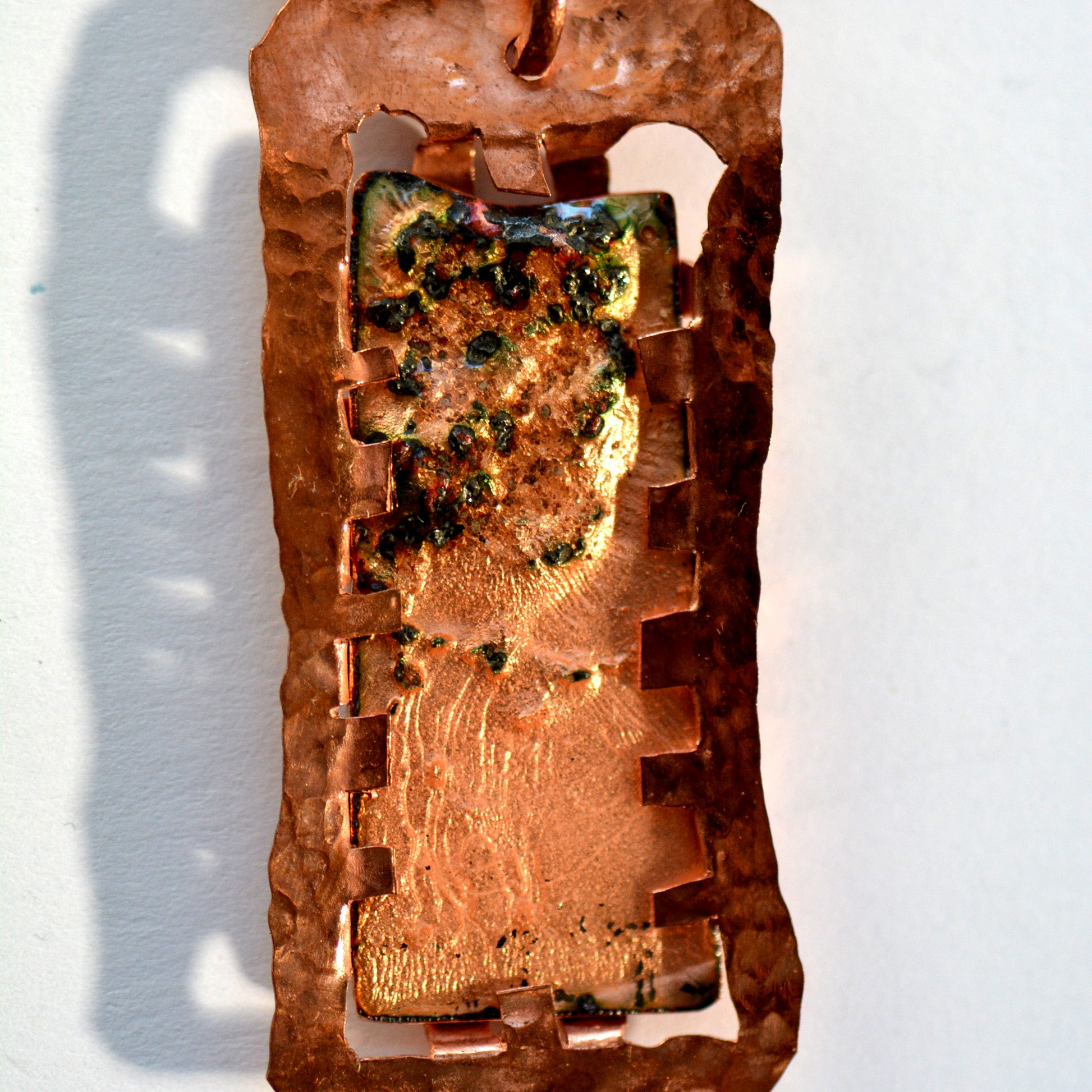 Una sperimentazione che gioca con la reticolazione e lo smalto trasparente. Una texture ricca che ricorda la madre terra, il colore oro pieno del rame, traspare attraverso toni di fondo rossi o giallastri sulla naturale ossidazione del rame.