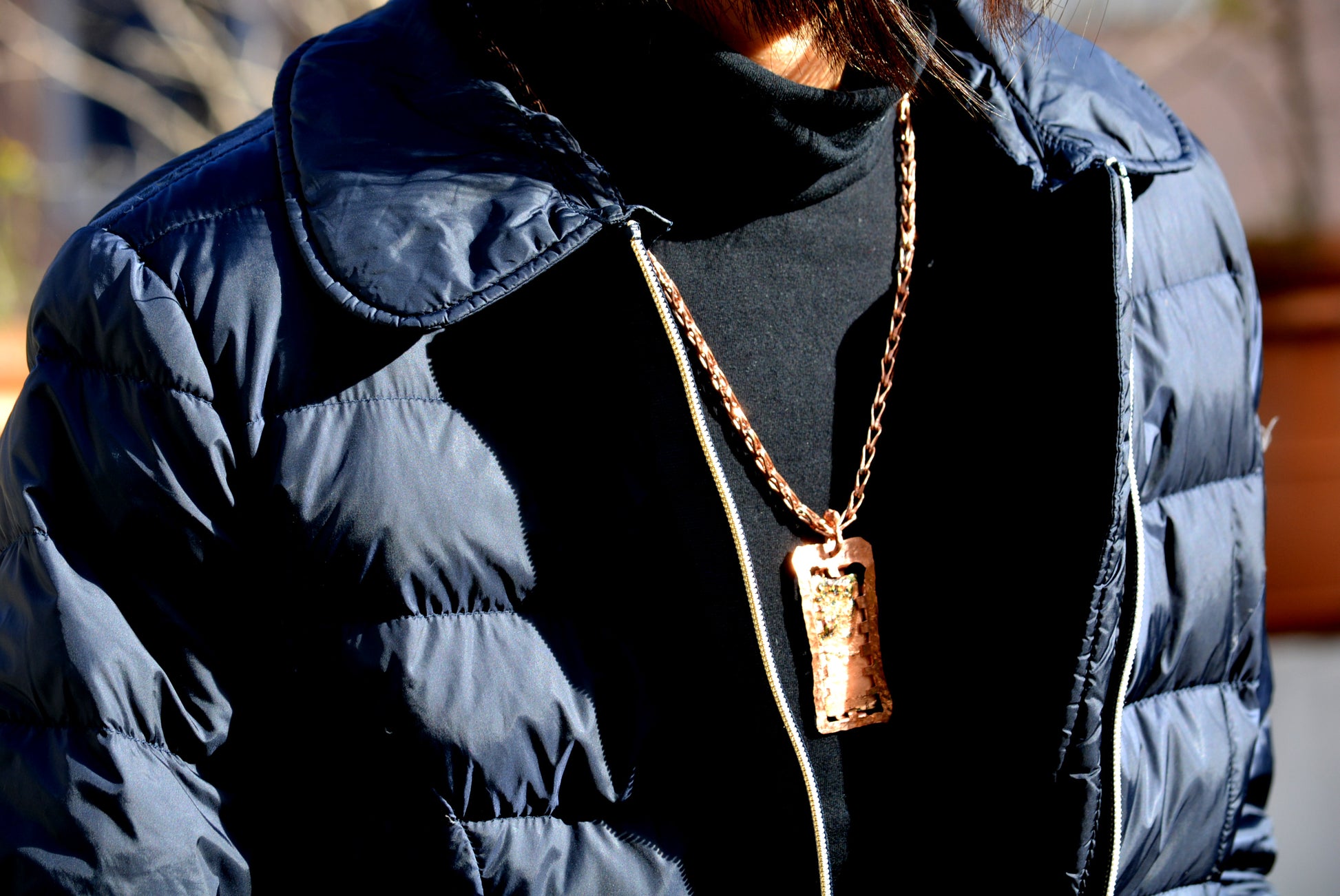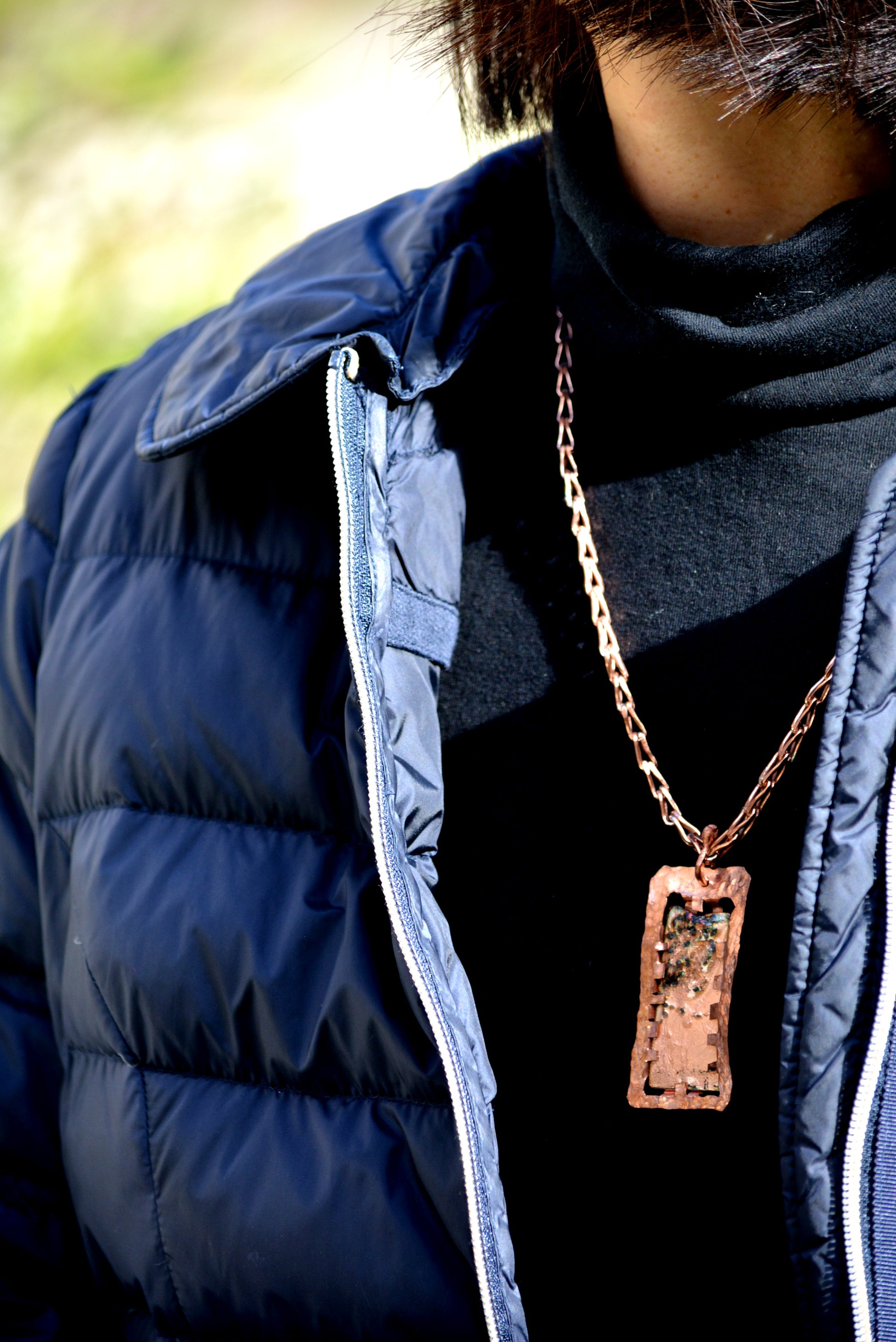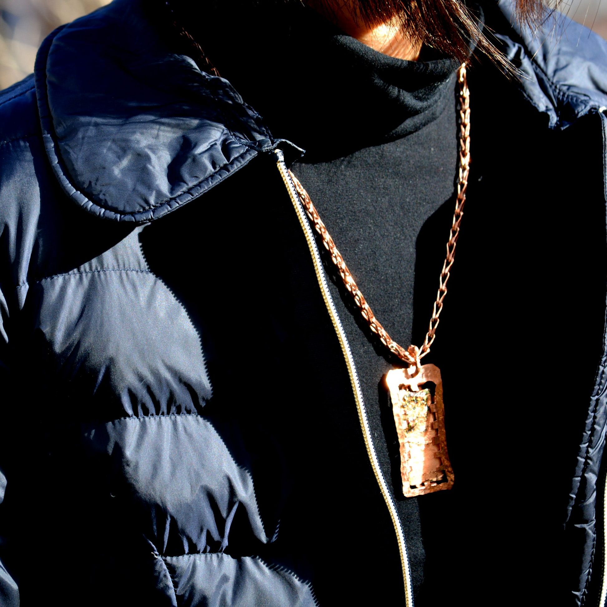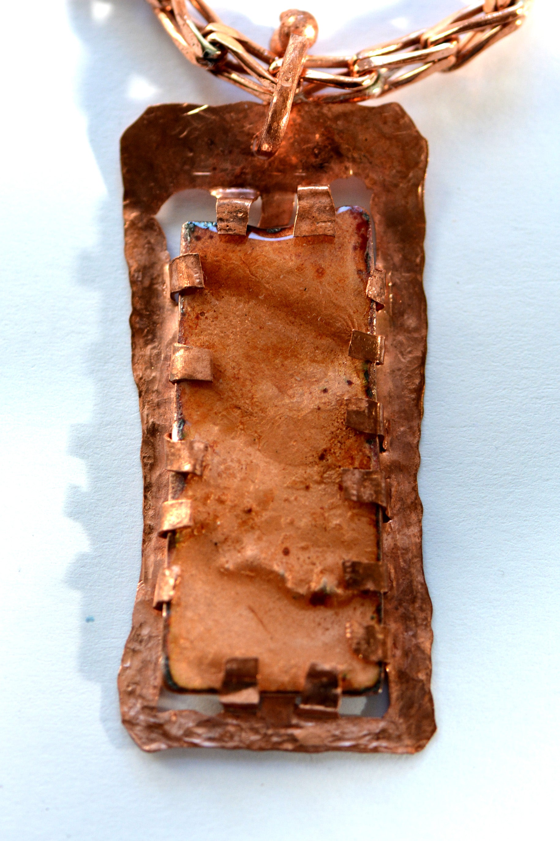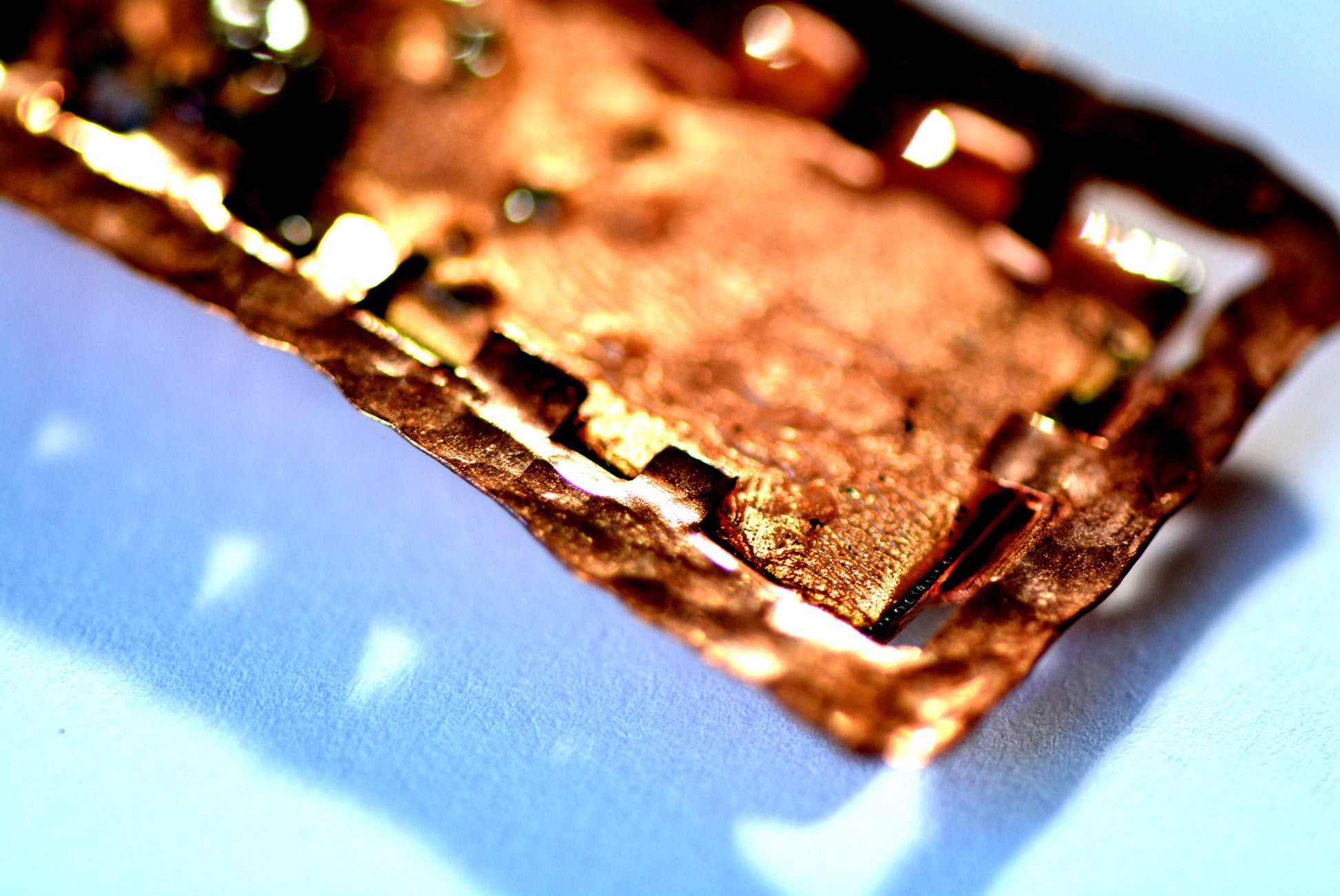 Una sperimentazione che gioca con la reticolazione e lo smalto trasparente. Una texture ricca che ricorda la madre terra, il colore oro pieno del rame, traspare attraverso toni di fondo rossi o giallastri sulla naturale ossidazione del rame.