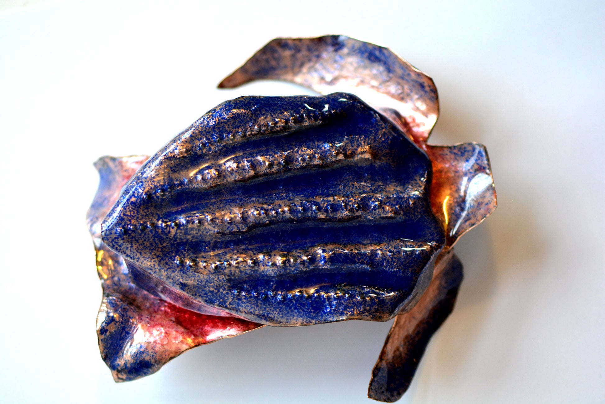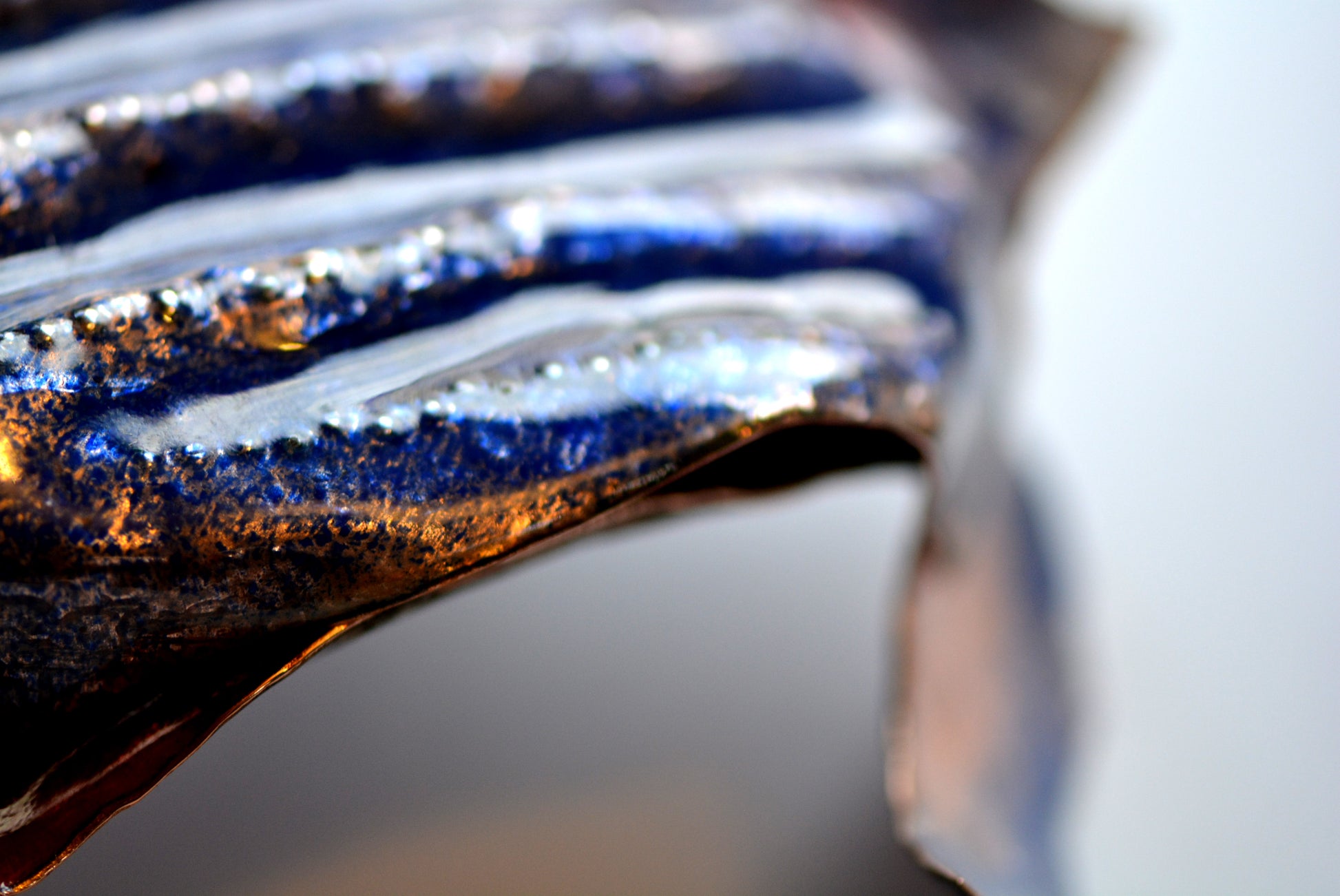 Un "oggetto d'arte" che richiama la Tartaruga Liuto - Dermochelys Coriacea. La più grande tra tutte le tartarughe viventi e il più pesante rettile non coccodrillo. Una fusione di colori che spaziano dal blu all'oro-argento, fino al rosso intenso dell'interno. Un'espressione di maestosità, forma, movimento ed eleganza racchiusi in un oggetto comune, privo di qualsiasi funzione, se non quella di essere eccezionale.