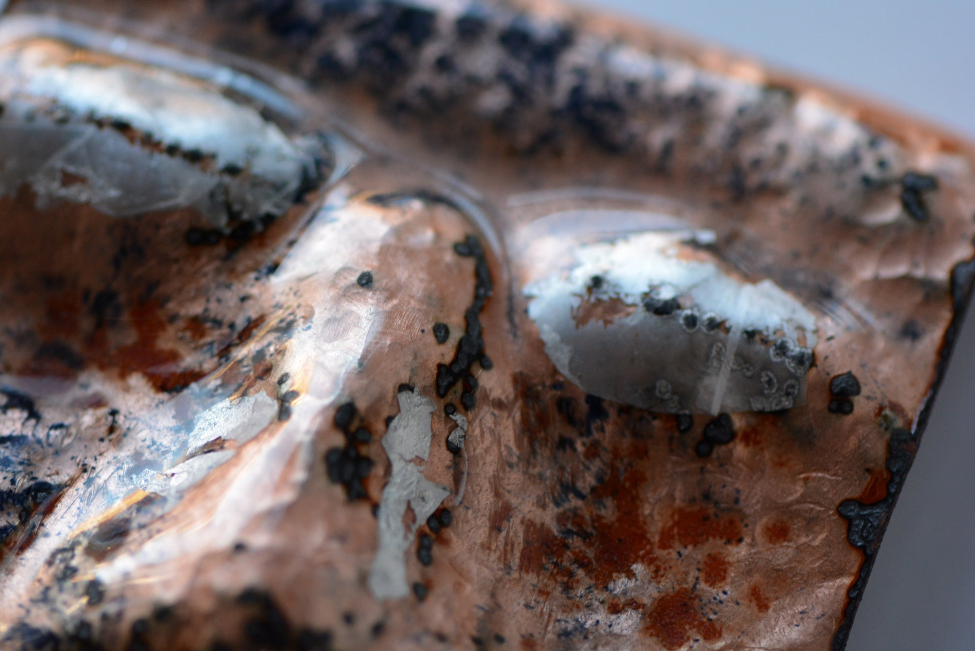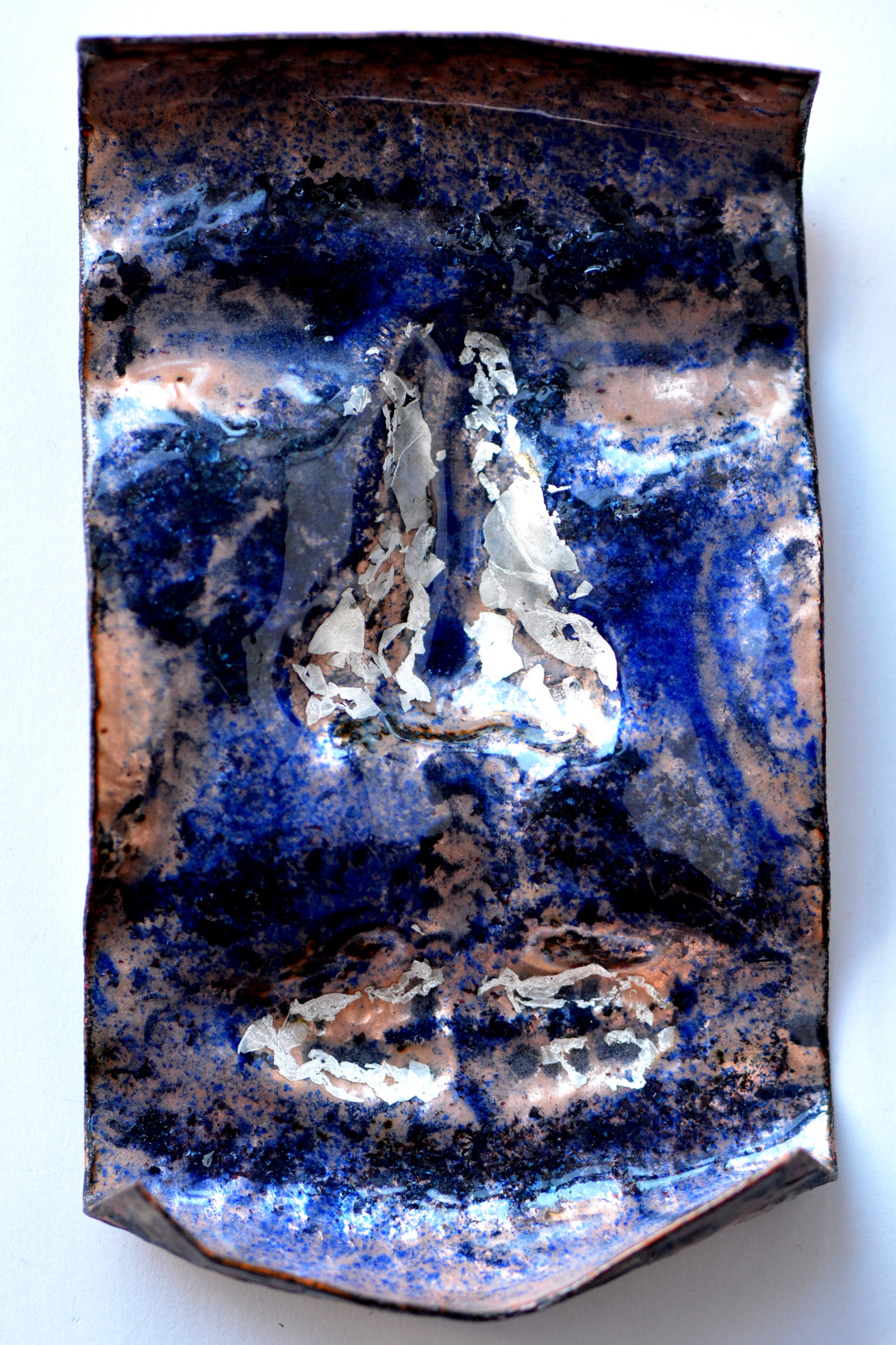 On the reverse side, the texture bears the cold of moonlight. Copper oxidation, firescale and black enamel enriches the already intricate surface of the hammered metal; black shadows trace the contours of a long-lived life. Silver foils highlight her eyes and lips, as though time itself had applied a final touch of makeup—an adornment of dignity and memory.Â