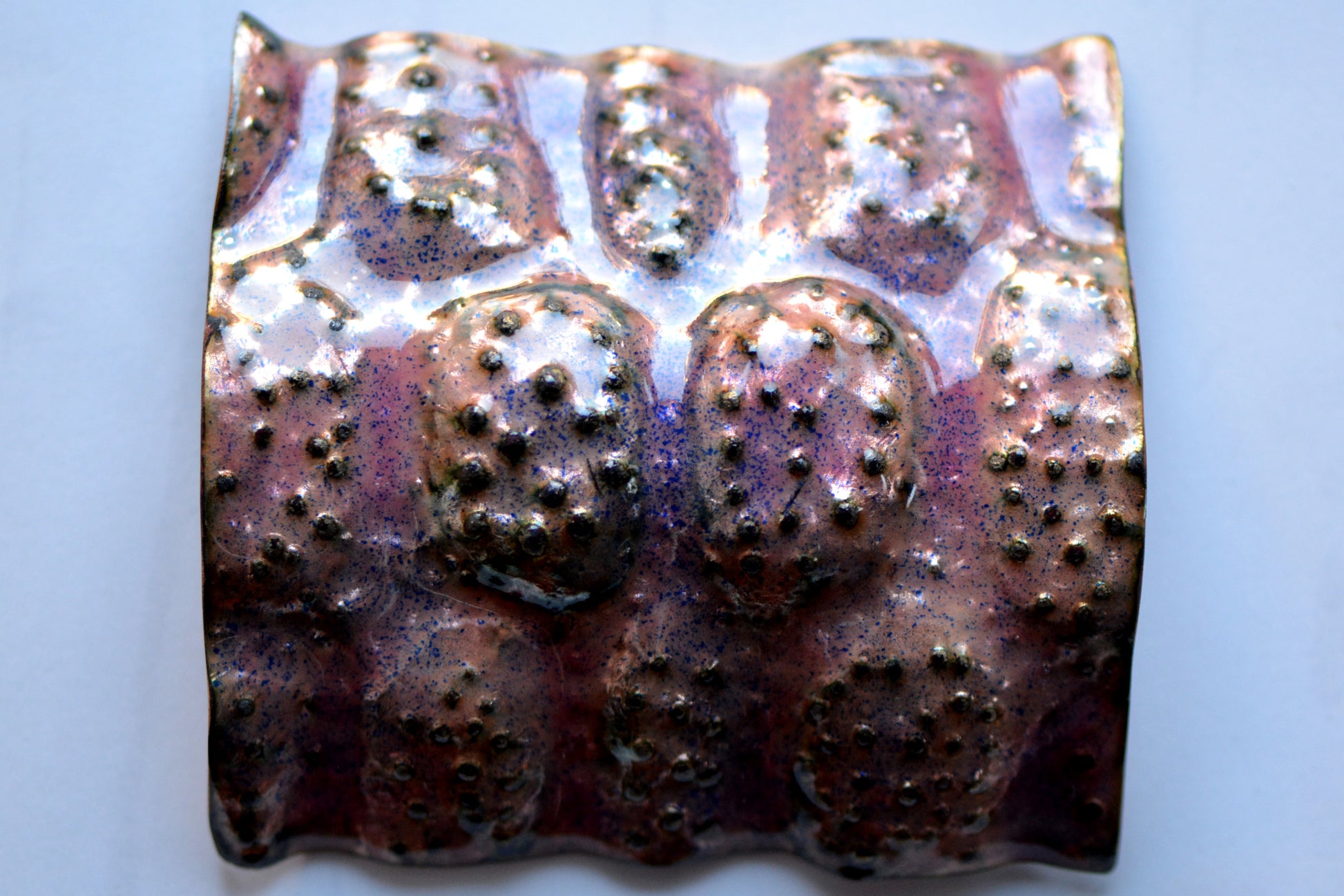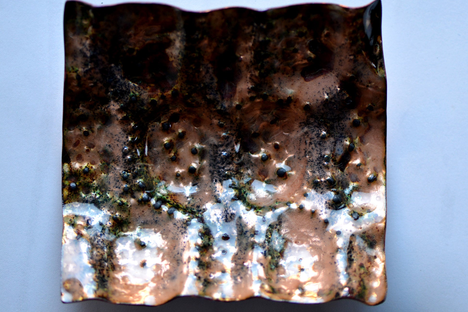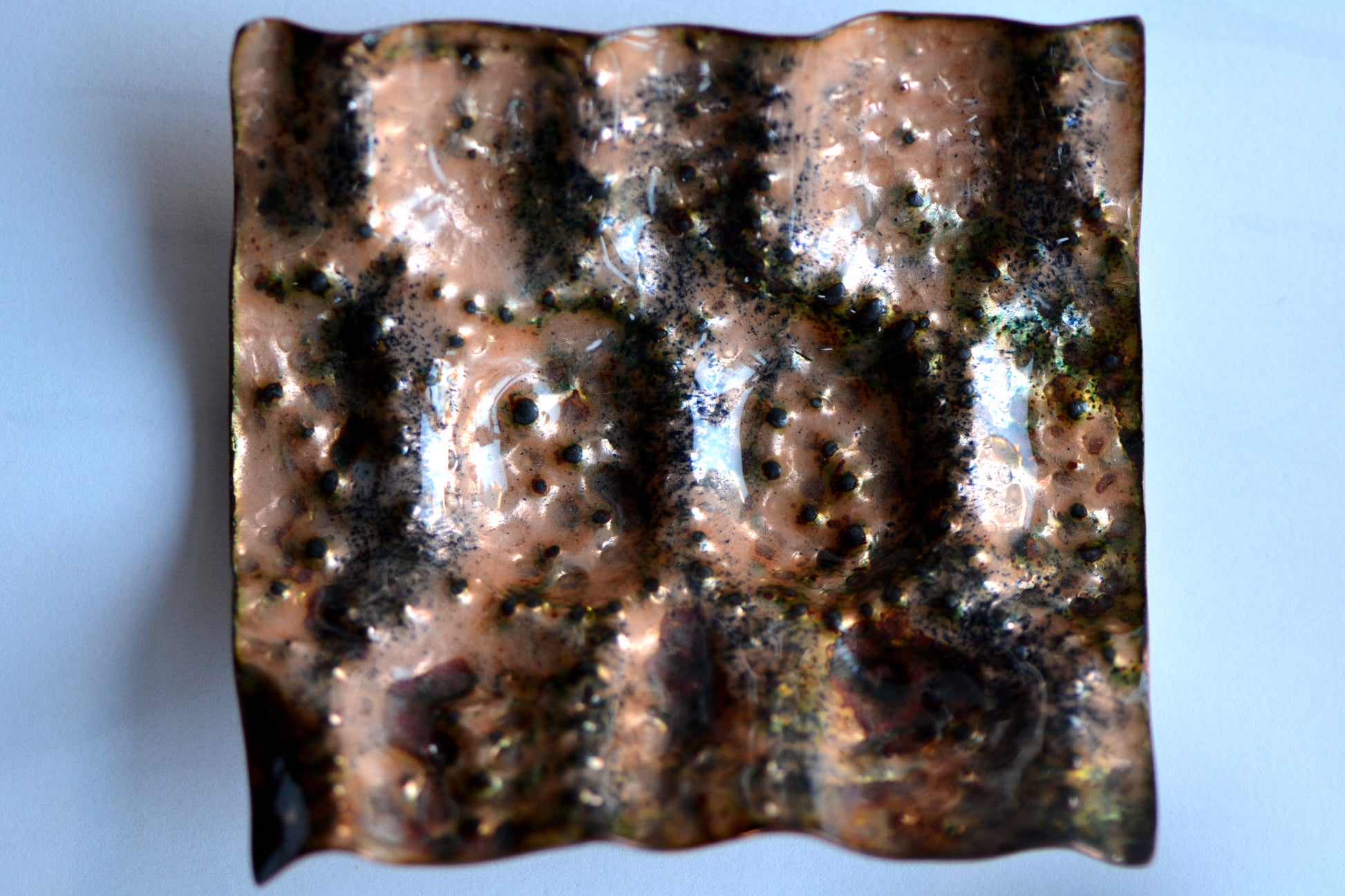 Una fusione di tonalitĂ blu, viola, rosa e rosso chiaro si intreccia con macchie di ossidazione del rame, creando una composizione di elementi organici. Lo smalto trasparente, applicato su una superficie di rame altamente lucidata, accentua la ruviditĂ delle protuberanze del guscio della tartaruga.