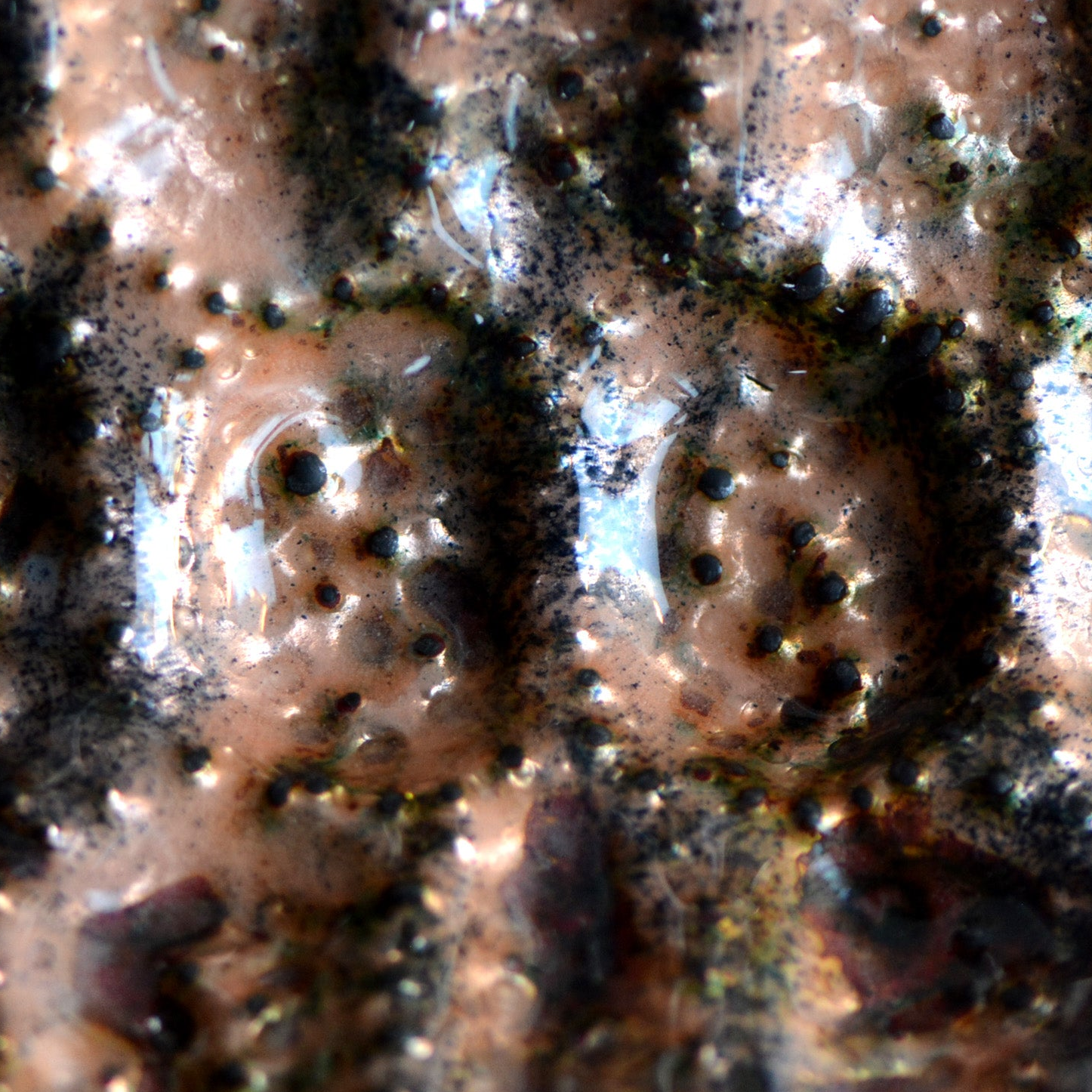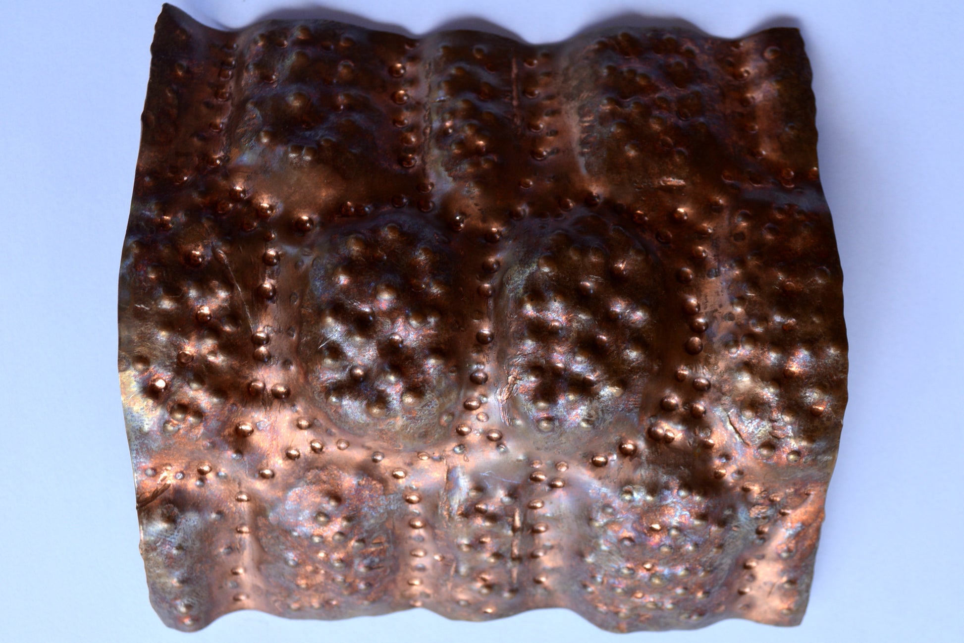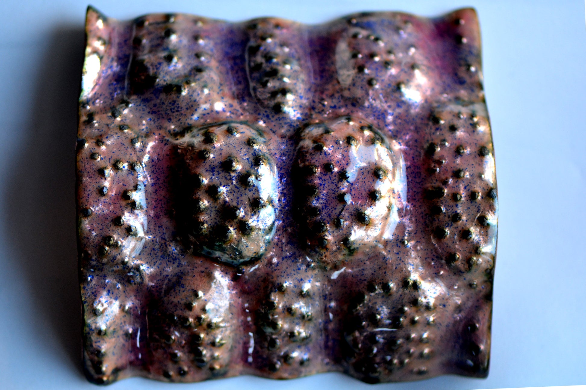 Una fusione di tonalitĂ blu, viola, rosa e rosso chiaro si intreccia con macchie di ossidazione del rame, creando una composizione di elementi organici. Lo smalto trasparente, applicato su una superficie di rame altamente lucidata, accentua la ruviditĂ delle protuberanze del guscio della tartaruga.