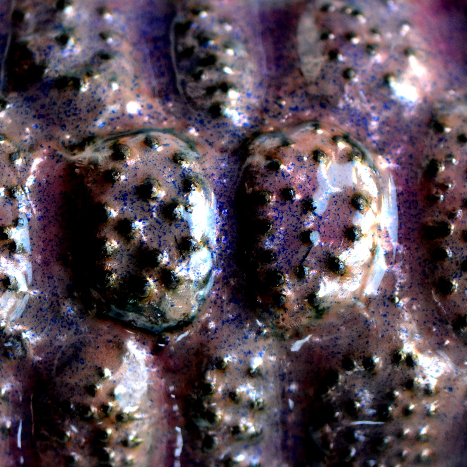 Utilizzando un martello da formatura, ricreo una texture e una forma naturali che richiamano il guscio di una tartaruga. Uno strato di base di smalto blu medio, combinato con rosso medio, si fonde in una tonalitĂ di smalto violetto-rosato. Rilievi riflettenti emergono da uno strato vivace con finitura a specchio.