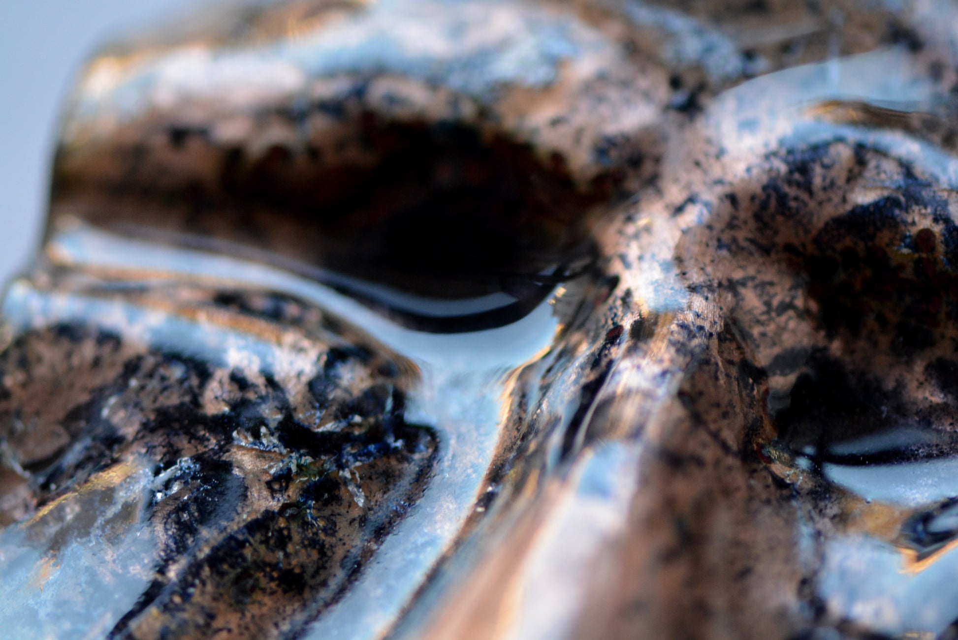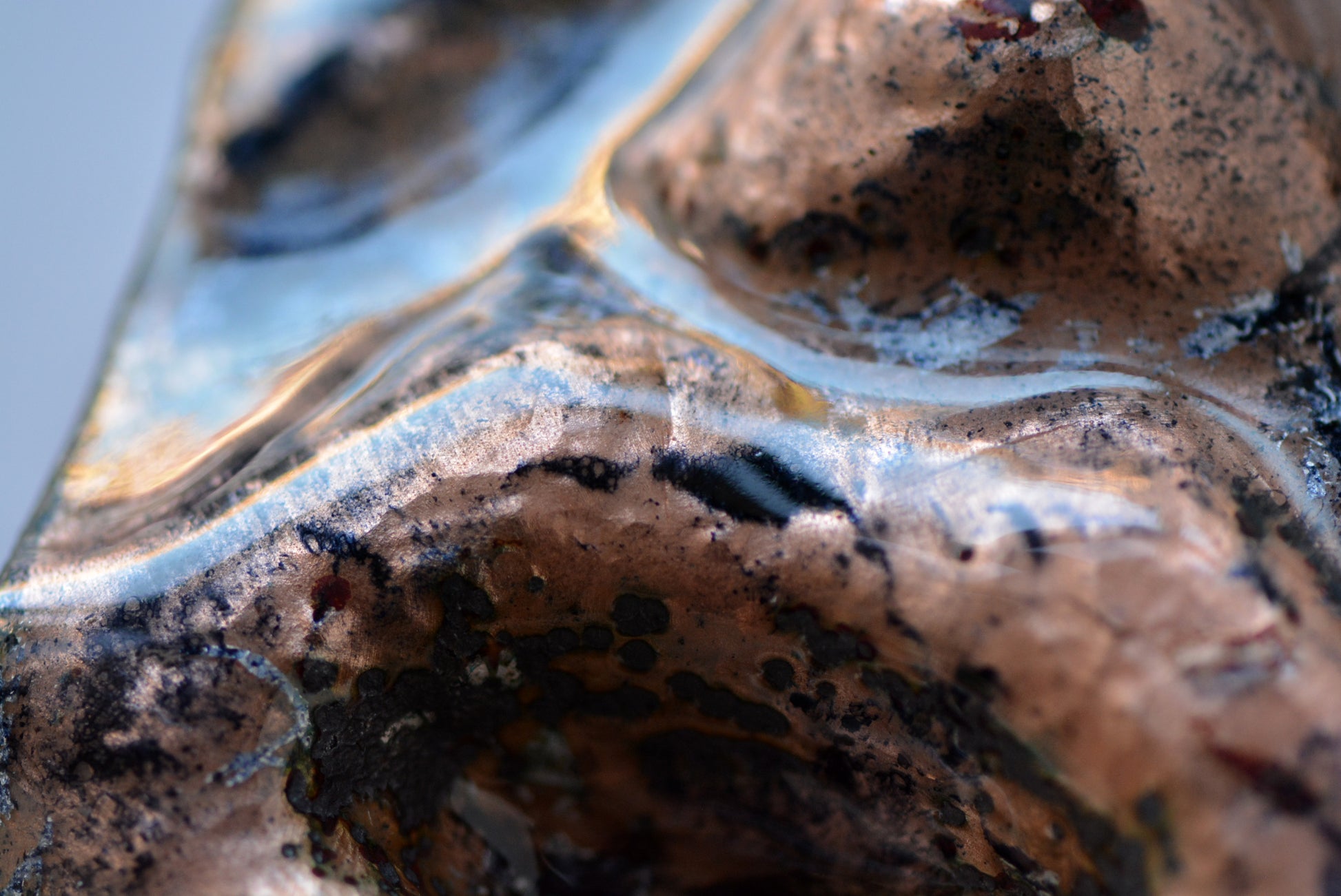 A combination of firescale, copper oxidation, black enamel, and silver foil renders the dark aspect of our modern world.