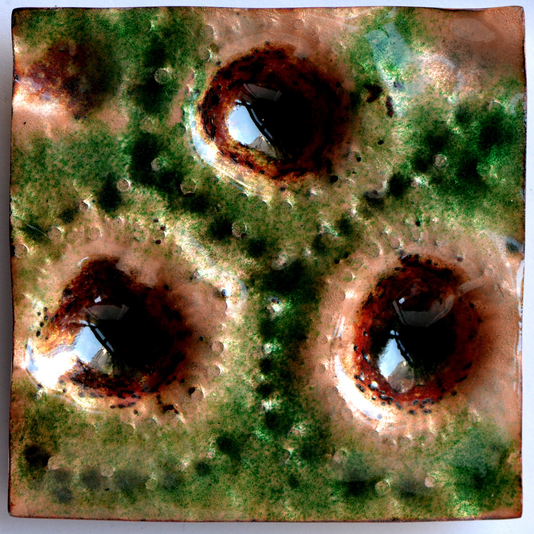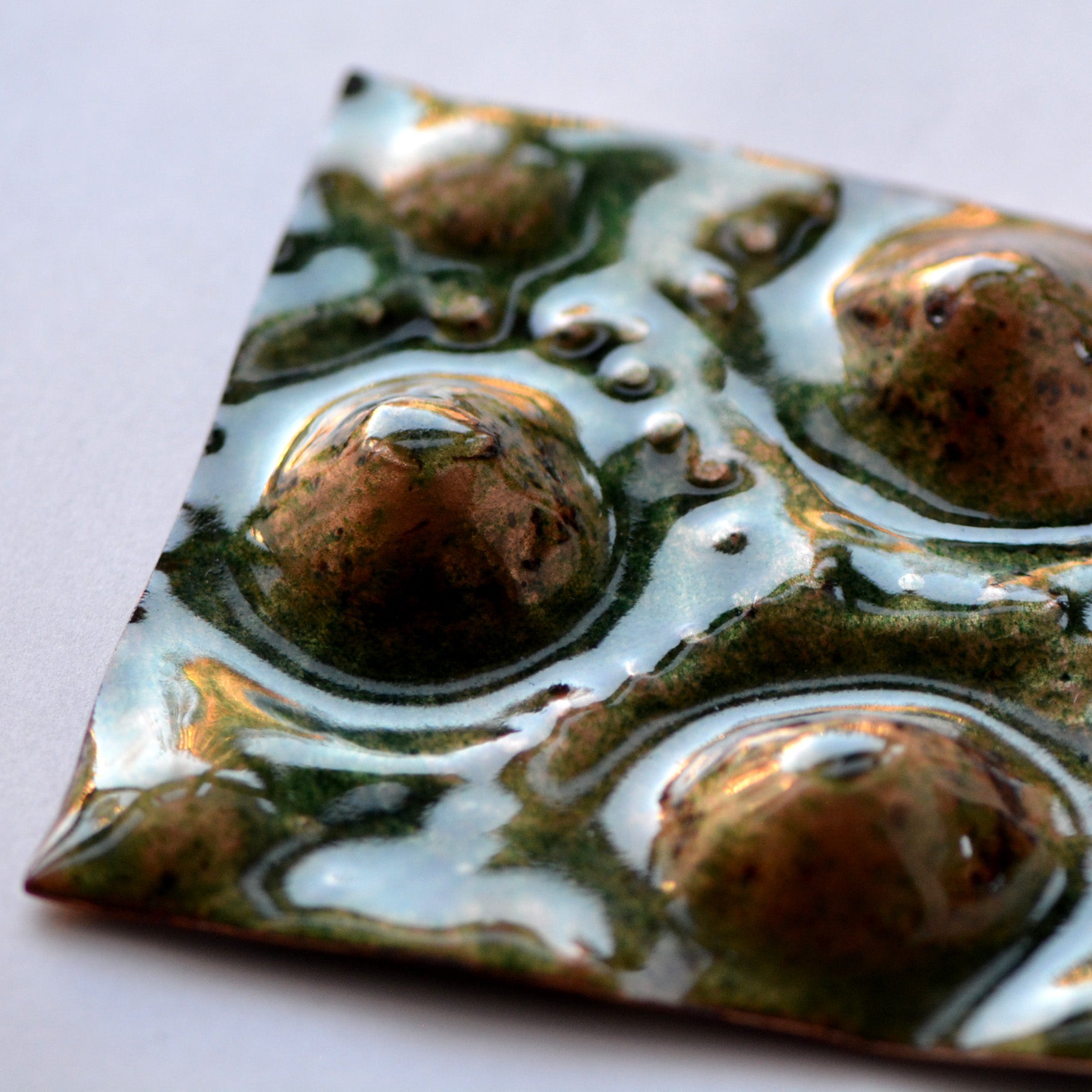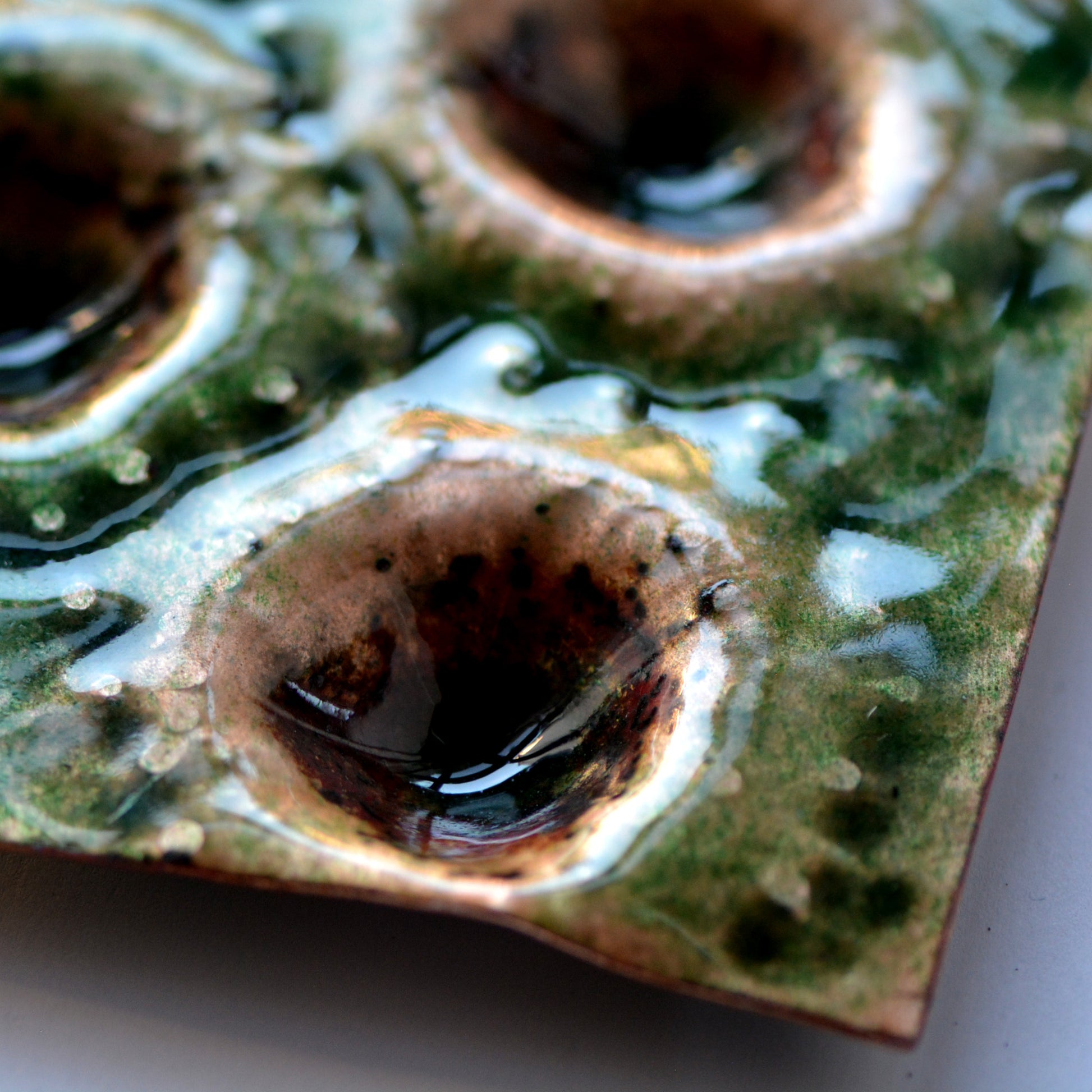 Shadows of enamel in olive and dark green, together with the interplay of copper oxidation and transparent enamel on a polished copper surface, evoke a natural texture—alive, organic, and in quiet harmony with the ritual’s spirit.
