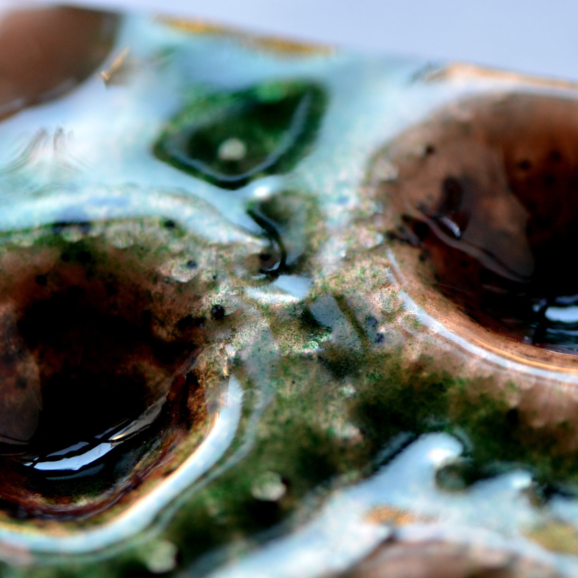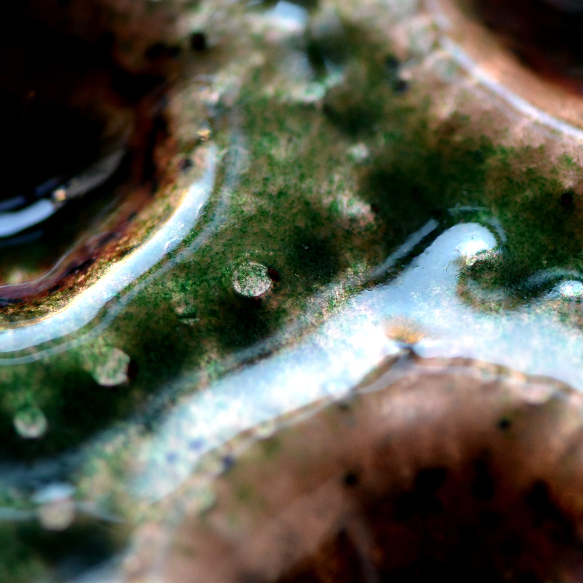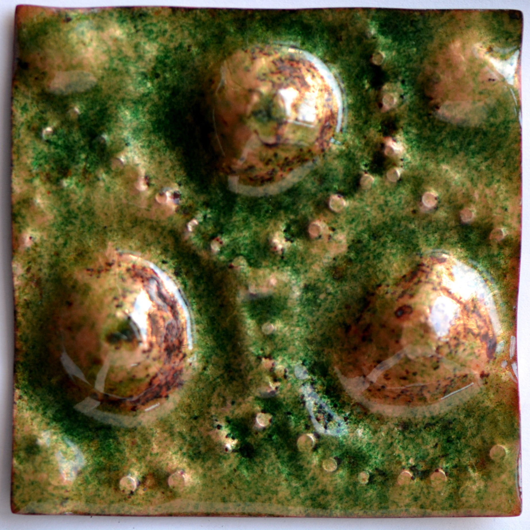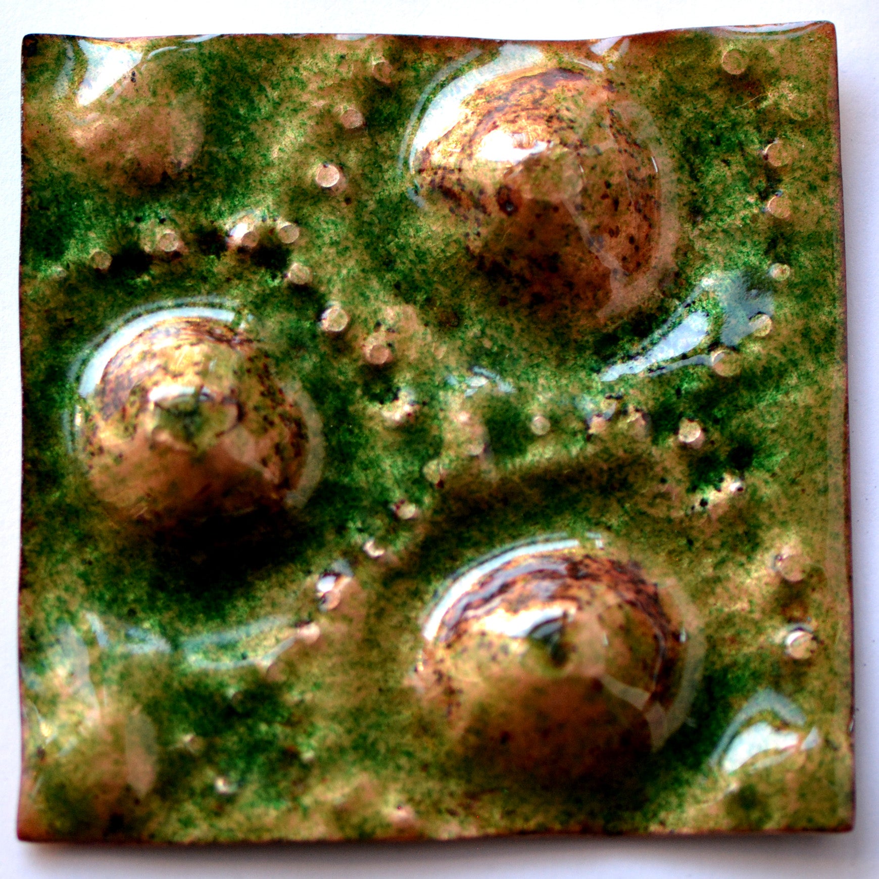 Shadows of enamel in olive and dark green, together with the interplay of copper oxidation and transparent enamel on a polished copper surface, evoke a natural texture—alive, organic, and in quiet harmony with the ritual’s spirit.